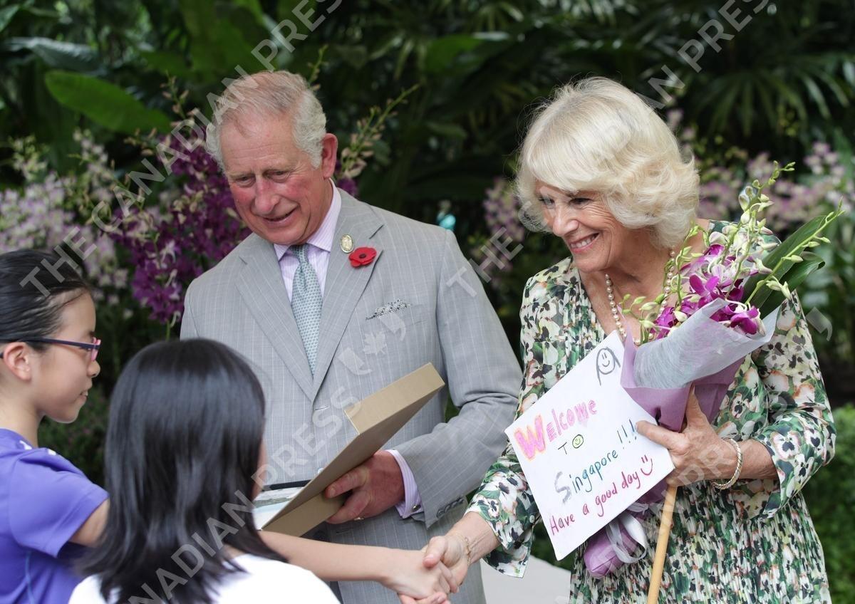 The Prince of Wales and The Duchess of Cornwall are presented with gifts after their visit to the National Botanical Gardens, Singapore.