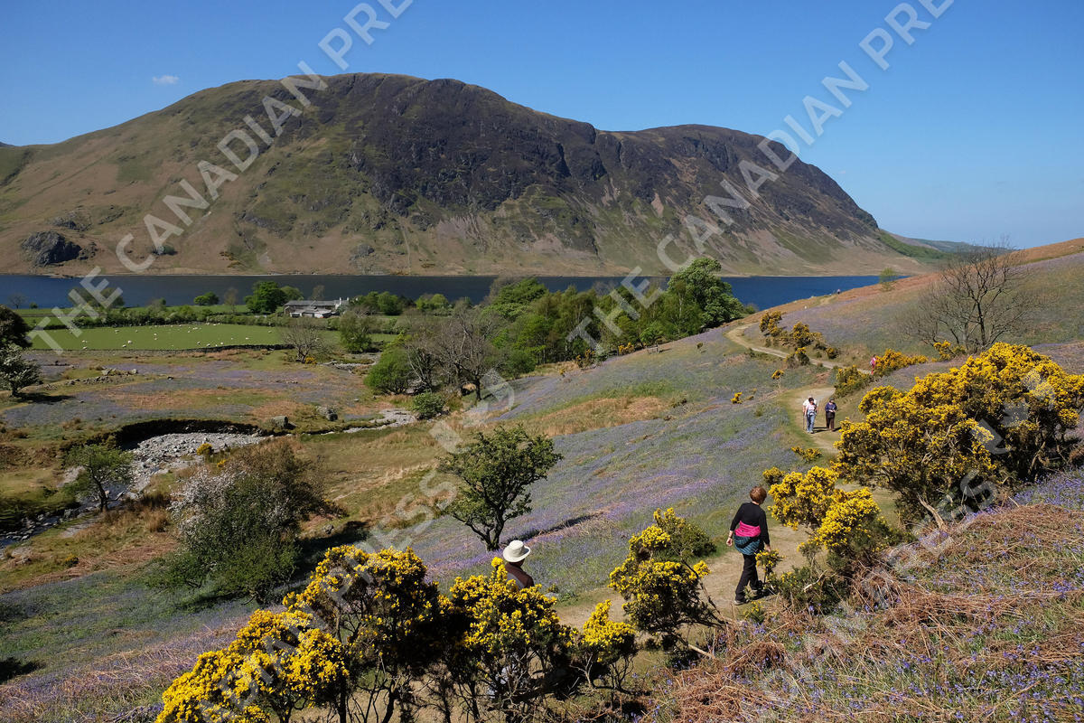 People walk through patches of Bluebells at Rannerdale Knott in the Lake District.