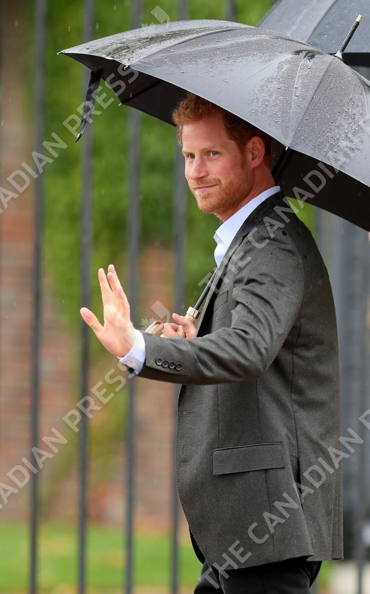 Prince Harry waves as he views tributes attached to the Golden Gates of Kensington Palace, left to his late mother Diana, Princess of Wales.