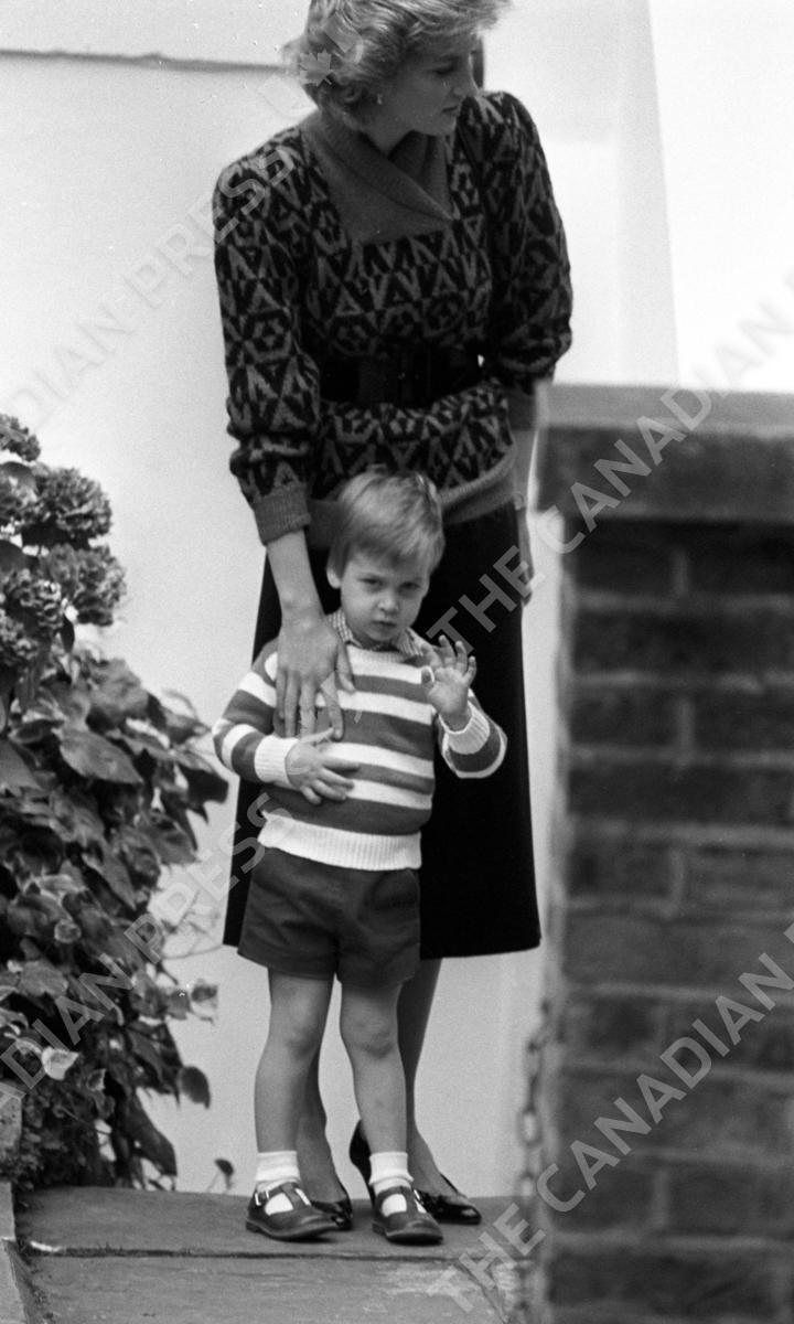 A shy wave from Prince William for photographers at Mrs Jane Mynor's private kindergarten in Notting Hill Gate, London, to record his first day at her nursery school in her Victorian terraced house in Chepstow Villas. The Prince was escorted by his parents, the Prince and Princess of Wales.
