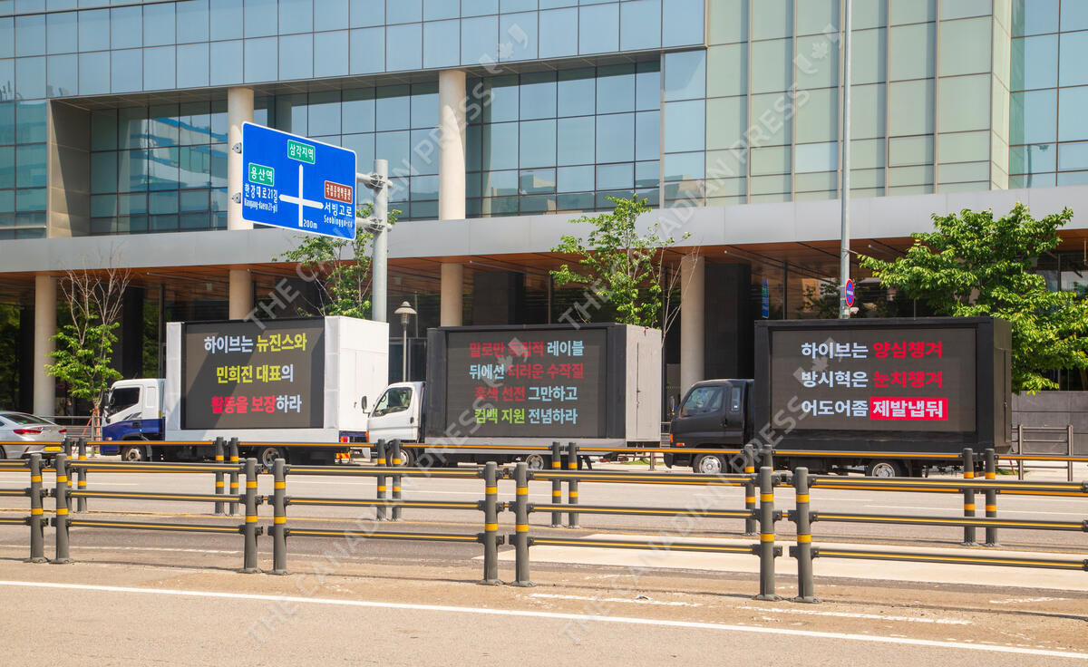 Protest trucks by fans of NewJeans, May 9, 2024 : Protest trucks deployed by fans of K-Pop girl group NewJeans are seen outside the headquarters building of the K-pop powerhouse Hybe in Seoul, South Korea. Members of Bunnies, the girl group's fandom, staged a protest outside the building of Hybe by deploying 'protest trucks' to voice their grievances against Hybe. The LED boards on trucks read (L-R), ''Hybe guarantee careers of NewJeans and Min Hee-Jin'', ''Hybe stop malicious propaganda and concentrate on support for comeback of NewJeans'' and ''Hybe have conscience!. Hybe, please keep your hands off ADOR!''. Min Hee-Jin is the CEO of ADOR, subsidiary company of Hybe. Bang Si-Hyuk is a founder and chairman of Hybe. Hybe filed a breach-of-duty complaint against Min Hee-Jin in April, claiming Min had plotted to usurp managerial control of the music label behind NewJeans. A Seoul court is deliberating on an injunction filed by Min to halt Hybe from firing her as ADOR CEO during an upcoming shareholders' meeting on May 31. Min is denying the accusation, local media reported. (Credit Image: © Lee Jae-Won/AFLO via ZUMA Press)