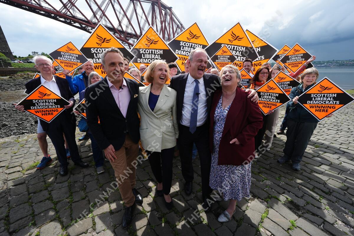 Liberal Democrat leader Sir Ed Davey stands with Alex Cole-Hamilton (left), and parliamentary candidates Susan Murray (centre) for East Dunbartonshire and Christine Jardine for Edinburgh West (right), during their party's Scottish launch at North Queensferry, while on the General Election campaign trail. Picture date: Monday May 27, 2024.