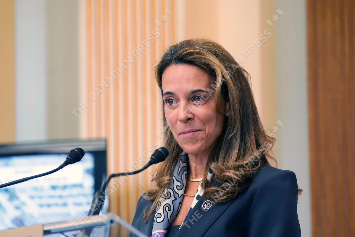 Quebec Housing Minister France-ƒlaine Duranceau is pictured at a press conference in Montreal, Quebec, Friday, April 19, 2024. THE CANADIAN PRESS IMAGES/Mario Beauregard