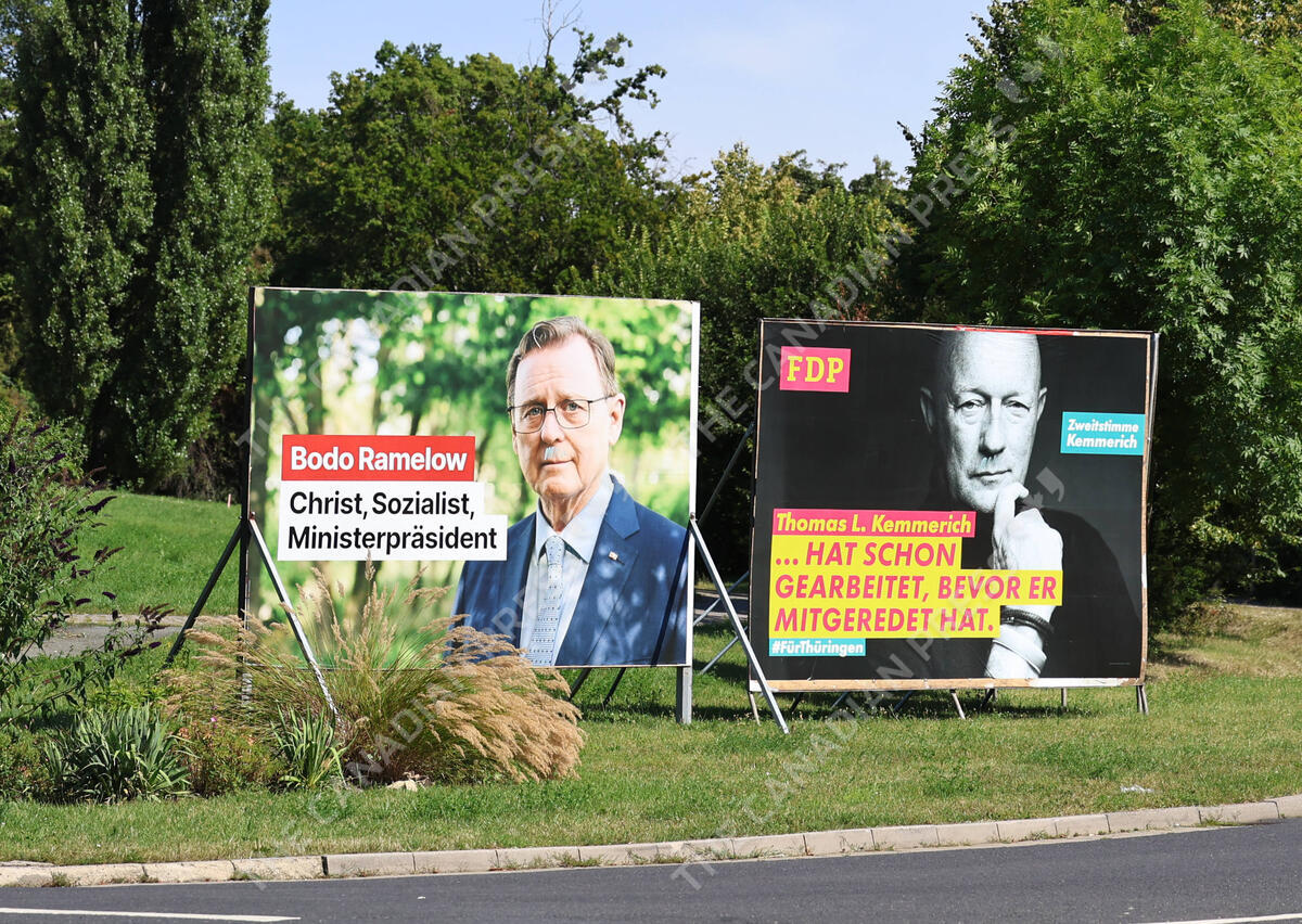 Wahlplakate 31.07.2024, Schoendorf, Wahlplakate zur Landtagswahl am 01.09.2024 in Thueringen im Bild: Grossflaechenplakat Die LINKE - Bodo Ramelow - Christ, Sozialist, Ministerpraesident, daneben ein Grossflaechenplakat der FDP - Thomas L. Kemmerich - Hat schon gearbeitet, bevor er mitgeredet hat *** Election posters 31 07 2024, Schoendorf, election posters for the state election on 01 09 2024 in Thuringia in the picture large poster The LINKE Bodo Ramelow Christian, Socialist, Prime Minister, next to it a large poster of the FDP Thomas L Kemmerich Has already worked before he has joined in the conversation