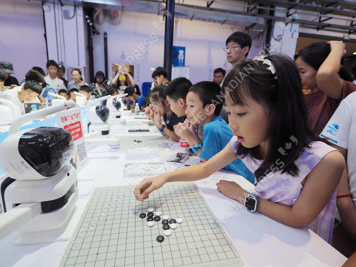 August 23, 2024, Beijing, Beijing, China: BEIJING, CHINA - AUGUST 22, 2024 - A spectator plays with a ''Go robot'' at the 2024 World Robot Conference in Beijing, China, August 22, 2024. (Credit Image: © Cfoto/DDP via ZUMA Press) *** Local Caption *** 23145024