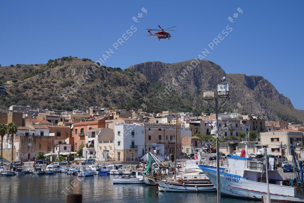 Fire service helicopter returns to port on the fourth day of the search and recovery operation after the luxury yacht Bayesian sank in a storm on Monday whilst moored around half a mile off the coast of Porticello, Sicily. The bodies of five of those missing were found on Wednesday, with four recovered, but the whereabouts of the missing sixth person remains unknown. Picture date: Thursday August 22, 2024.