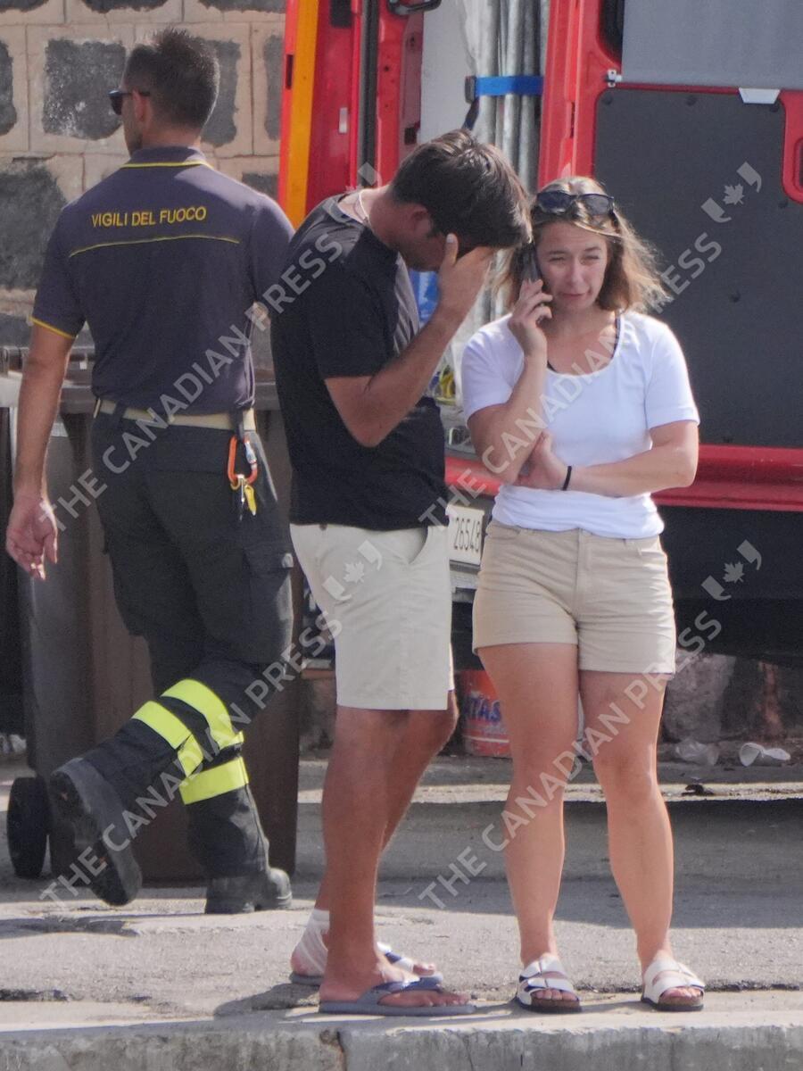 Two people (names not known) react as they visit members of the emergency services at the base for rescue operations in Porticello Harbour, Sicily, on the fourth day of the search for the six tourists missing after the luxury yacht sank in a storm on Monday whilst moored around half a mile off the Sicilian coast. The body of a fifth missing person has been recovered this morning, following the recovery of four others on Wednesday. Picture date: Thursday August 22, 2024.
