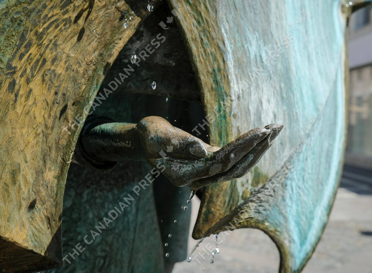 The hand of sculpture catches rain drops in Trelleborg, Sweden, Friday, July 28, 2023. THE CANADIAN PRESS IMAGES/Jeff McIntosh