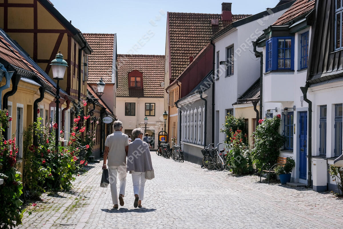 A couple walk down a colourful street in Ystad, Sweden, Tuesday, July 25, 2023. THE CANADIAN PRESS IMAGES/Jeff McIntosh