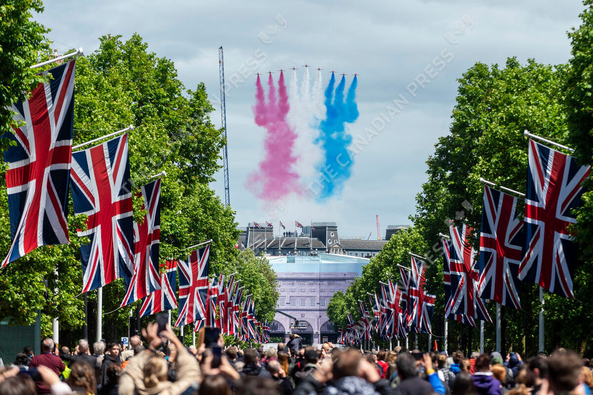 LONDON, June 16, 2024 People watch a flypast over the Mall after the Trooping the Colour parade to honour Britain's King Charles III on his official birthday in London, Britain, on June 15, 2024. (Credit Image: å© Stephen Chung/Xinhua via ZUMA Press)